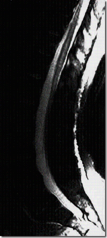 Un ejemplo de estas mielopatías postmanipulativas es el descrito por Morandi (29). Este autor refiere el caso de una paciente que sufrió una paraplejia aguda de los miembros inferiores ocho horas después de una manipulación lumbar practicada por un médico. La primera RMN realizada en el servicio de urgencias reveló la existencia de un edema del cono medular, sin lesión articular ni discal. Diez meses más tarde el edema había evolucionado a una atrofia medular lumbar.
