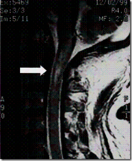 Otro ejemplo de este tipo de mielopatías postmanipulativas lo describió Chung (16). Se trataba de un varón de 46 años, con antecedentes de parálisis del VI par craneal y neuritis retrobulbar, que tras recibir una manipulación cervical por parte de un bonesetter chino sufrió una tetraplejia súbita con dificultades respiratorias. La RMN cervical practicada de urgencia reveló un edema medular C1-C2, con ausencia de alteraciones articulares y discales. Tras el tratamiento farmacológico, a los 5 días el paciente volvió a caminar. La mejoría fue progresiva hasta la aparición, 8 meses después de la manipulación, de una diplopia súbita. La RMN practicada en esta ocasión reveló que el edema cervical había evolucionado a una siringomielia cervical.
